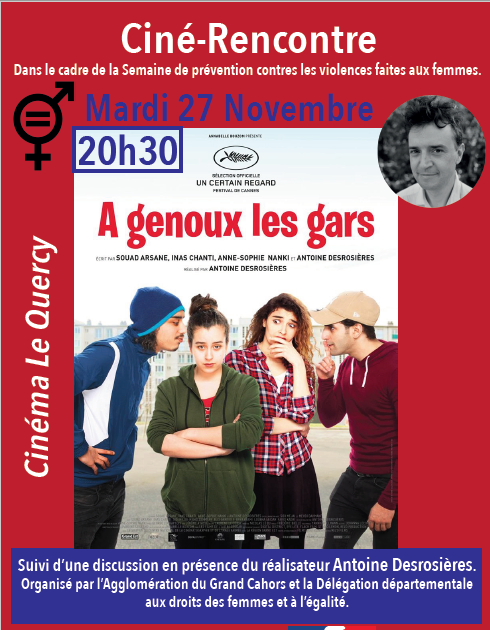 Semaine d’actions du 24 au 29 novembre sur le thème : «Harcèlement sexiste et sexuel» Mardi 27 novembre au cinéma Le Quercy, projection du film d’Antoine Desrosières «À Genoux les gars» Le mercredi 28 au théâtre de Cahors, la pièce de Bruno Cadillon, «La Cave»