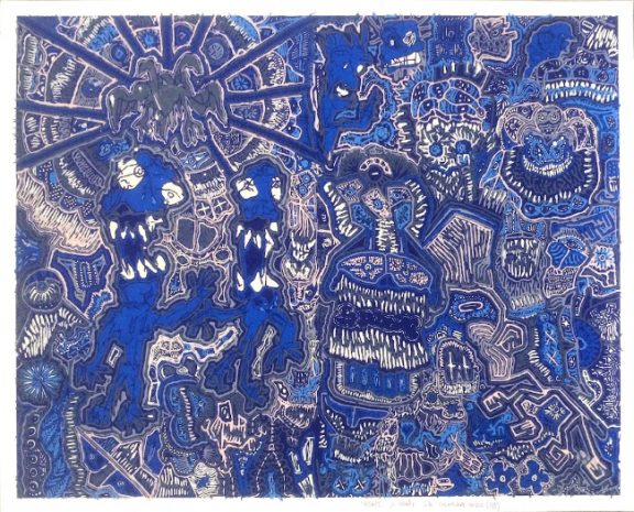 On ira se frotter aux papiers bleus, petits formats presque timides mais grouillants d’énergie, de JB Hanak, musicien hyperactif du groupe dDash au fier rock indie, également vu chez agnès b. la fureteuse. Tatouant tout en sérigraphies et rehauts or ou blanc, il nous livre des territoires un peu pop, des parcelles, des chemins, en signes soudés et éclatés. Une vraie découverte à suivre.