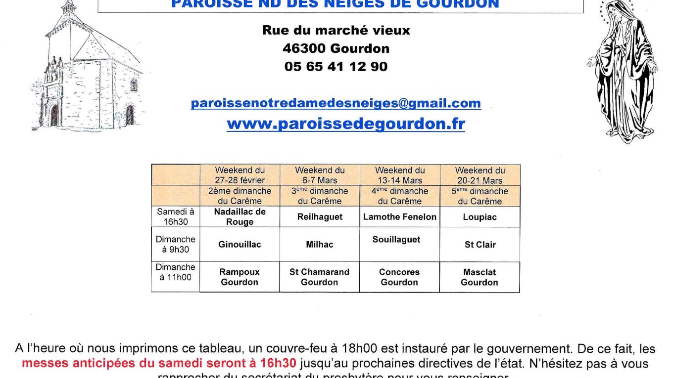 Les messes anticipées du samedi étant habituellement à 17h30, se voient avancées à 16h30 à cause l’heure du couvre-feu. Ceci afin de laisser le temps aux personnes de revenir chez elles après la rencontre…