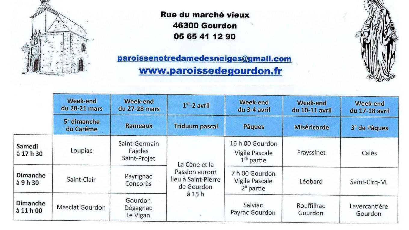A cause de la crise sanitaire, les horaires habituels sont quelque peu chamboulés. Jeudi Saint et Vendredi Saint l’après-midi. Vous noterez que la Vigile pascale aura lieu en deux parties : l’une l’après midi, et la suite le lendemain matin de bonne heure… Avis aux lève-tôt !