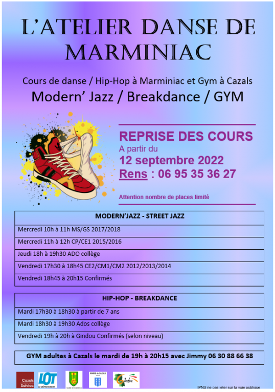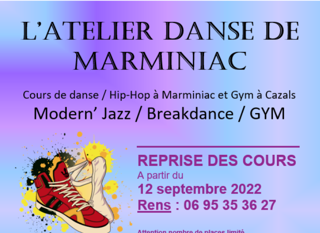 C’est la rentrée pour L’atelier Danse de Marminiac Publié le mardi, 6 septembre 2022mardi, 6 septembre 2022 par Justine Reprise des cours à partir du 12 septembre. Danse, hip-hop et Gym. Renseignements 06 95 35 36 27