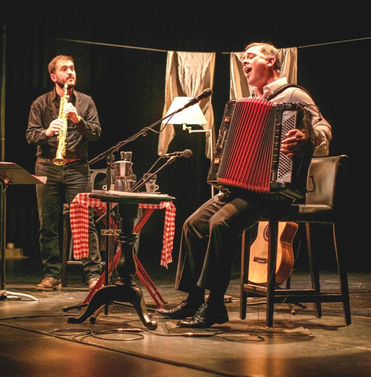 L’un  joue de l’accordéon et chante, l’autre joue des saxo baryton et soprano et tous deux, légers, graves, lyriques et toujours passionnés content en musique l’histoire de la mélodie italienne, de la mélopée napolitaine à l’opéra, en passant par la chanson populaire ou partisane, chant d’exil ou de résistance.