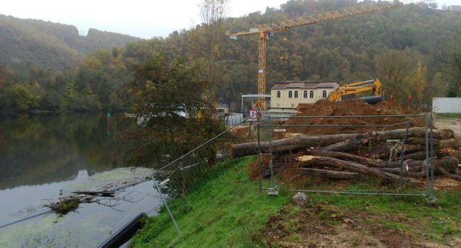 Les travaux effectués à cette centrale pour ajouter une 3e turbine afin de produire 20 % de puissance supplémentaire ont nécessité dès le printemps 2017 l’apport de terre transportée par l’équivalent de 4 000 camions afin de mettre à sec une partie du Lot, juste devant la centrale, pour y couler des tonnes de béton. Aujourd’hui le béton coulé après avoir séché, il faut enlever la terre correspondant aux 4 000 camions.