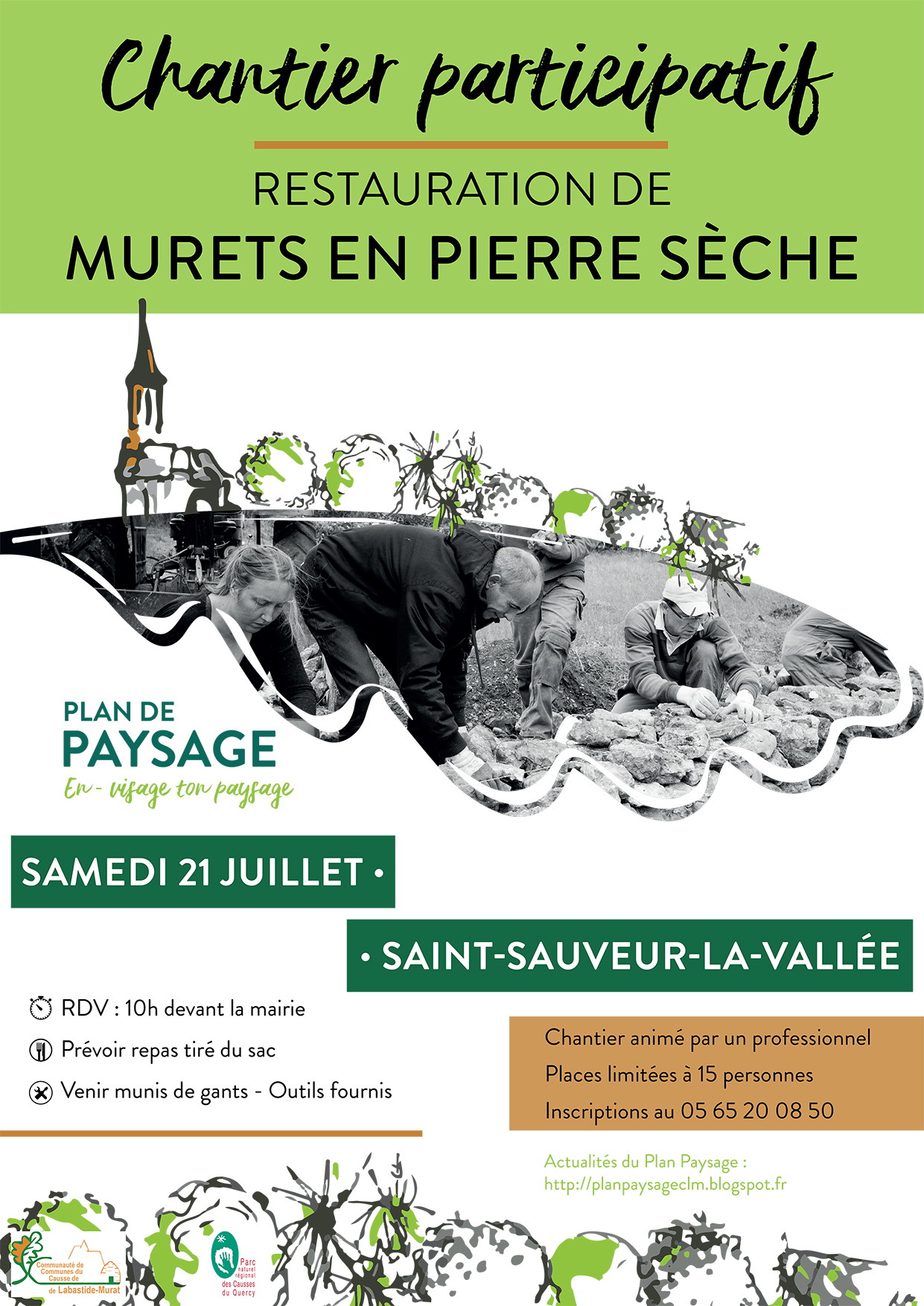 Samedi 21 juillet, la Communauté de communes du causse de Labastide-Murat et le Parc naturel régional des causses du Quercy organisent un chantier participatif de restauration de murets en pierre sèche à Saint-Sauveur-la-Vallée, sur la commune de Cœur-de-Causse.