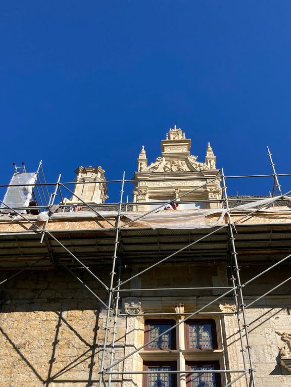 Au château de Montal, depuis le début des travaux sur les toitures, les équipes sont mobilisées pour que l’expérience de visite reste aussi riche et complète. Des échafaudages sont encore présents sur les façades de l’aile nord-est, mais un grand soin a été apporté lors de leur montage pour que les décors sculptés restent bien visibles, de près comme de loin. Le public peut aujourd’hui admirer les premières lucarnes nettoyées, restaurées, mais également les impressionnantes cheminées, les corniches, le faîtage… tous ces éléments parfois moins admirés que les façades sculptées de la cour intérieure.