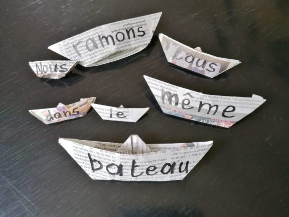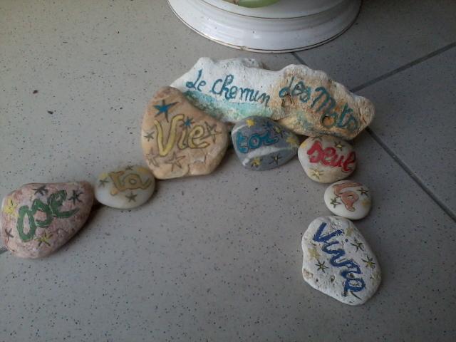A vous de faire le chemin des mots…. avec ce qui vous tombe sous la main, brindilles, pétales, pâtes, terre…..etc…