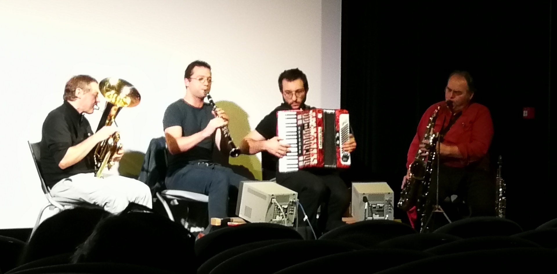 Musique en direct par Georges Petit (saxophones), Xavier Vidal (violon, tuba, cabrette, caramèla), Bastien Fontanille (accordéon, vielle) et Guilhem Boucher (violon, clarinette, chant). Une soirée à ne pas manquer !