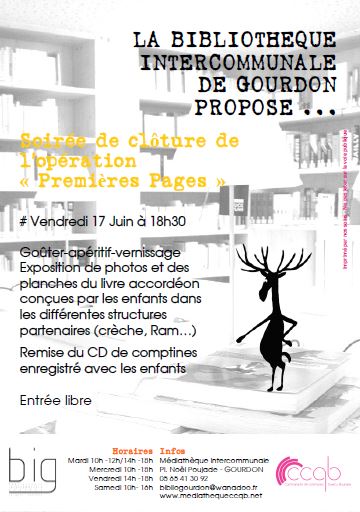 Clôture de l’opération « Premières Pages » à la BIG Publié le mercredi, 15 juin 2016mercredi, 15 juin 2016 par Bibliothèque Intercommunale Gourdon .Soirée de clôture de l’opération « Premières Pages » à la BIG vendredi 17 juin à 18h30 entrée libre .