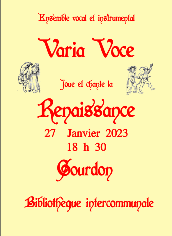 Concert à la BIG ! Publié le mercredi, 25 janvier 2023 par Bibliothèque Intercommunale Gourdon Venez découvrir le chœur de femmes Varia Voce qui interprète des chants de la Renaissance à la Bibliothèque Intercommunale de Gourdon : vendredi 27 janvier à 18h30.Entrée libre.