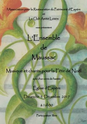 Le 3 décembre à 16H30, dans l’Église d’Espère, l‘Association pour la Restauration du Patrimoine d’Espère et le Club Amitié Loisirs d’Espère vous proposent un concert suivi d’un verre de l’amitié.