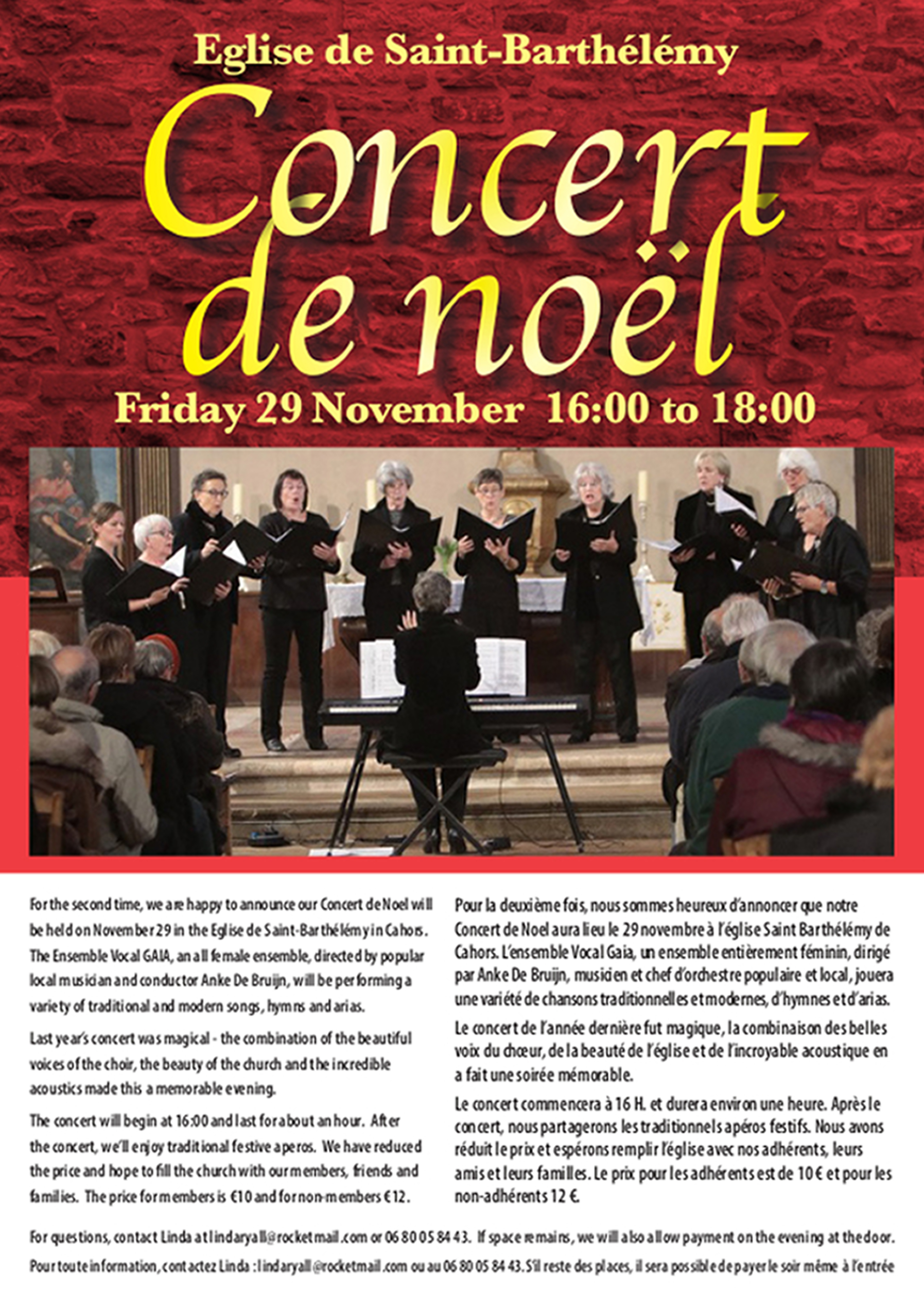 Concert de Noël à Cahors Publié le mercredi, 20 novembre 2019vendredi, 22 novembre 2019 par ChefsdoeuvreenPeyrilles N’oubliez pas de réserver votre place pour ce fantastique concert de Noël. Pour les billets, contactez Linda Ryall à lindaryall@rocketmail.com ou téléphonez-lui au 06 80 05 05 84 43, comme indiqué dans le flyer !