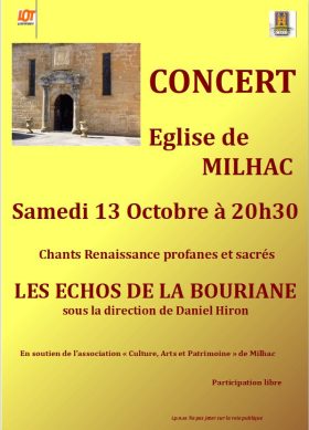La chorale de Gourdon » Les Echos de la Bouriane » retrouvera avec plaisir l’église de Milhac pour son prochain concert samedi 13 Octobre à 20h30 , accueillie par l’Association patrimoine et culture de Milhac.