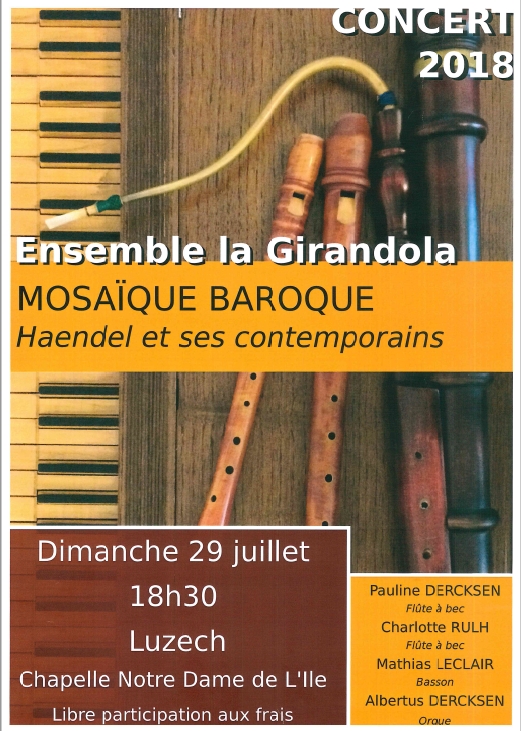 Le dimanche 29 juillet, à la chapelle Notre-Dame de l’Ile, venez écouter Pauline Dercksen et Charlotte Ruhl à la flûte à bec, Mathias Leclair au basson, Albertus Dercksen à l’orgue pour une mosaïque baroque !