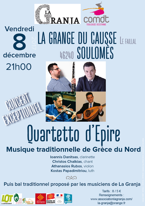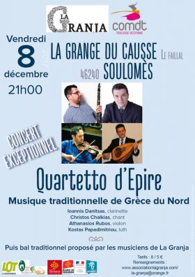 Les musiciens du Quartetto venus expressément de Grèce vous proposeront une rencontre/découverte des musiques traditionnelles de l’Epire. Cette rencontre est ouverte à tout musicien, chanteur ou curieux.