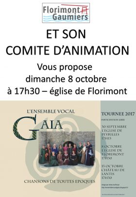 Concert GAIA à Florimont gaumier Publié le mardi, 3 octobre 2017dimanche, 8 octobre 2017 par comité d' animation de Florimont Gaumier Eglise de Florimont – Entrée au chapeau Dimanche 8 octobre .