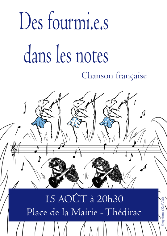 Des Fourmi.e.s dans les Notes, c’est 2 musiciens, 5 chanteur.se.s autour d’un répertoire de chansons françaises à découvrir et redécouvrir. RDV mardi 15 août place de la mairie à 20h30.