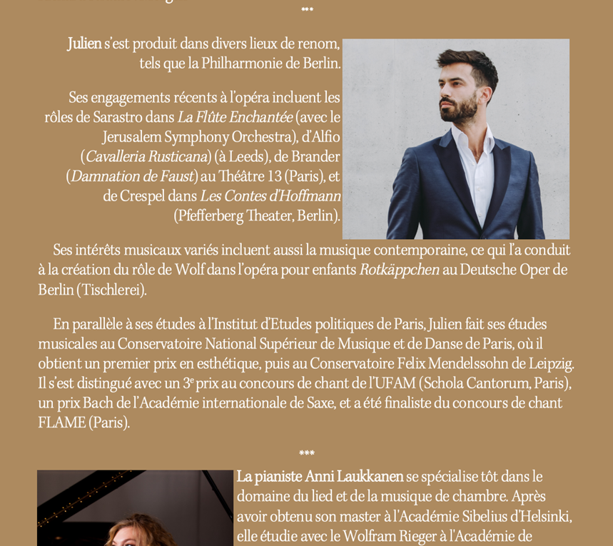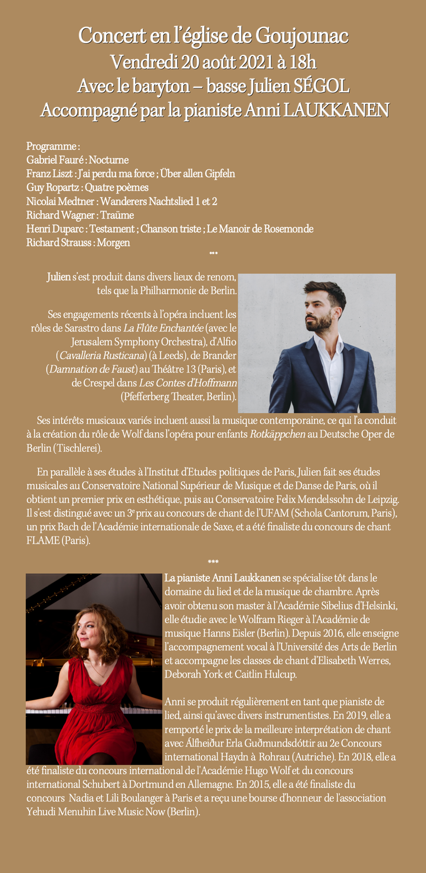 Le baryton-basse Julien SEGOL, originaire de notre territoire de Bouriane sera accompagné par la pianiste Anni LAUKKANEN, tous deux concertistes de niveau international.