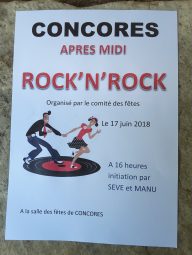 vous rêvez de vous lancer et d’apprendre enfin à danser le rock’n’roll? Le comité des fêtes de concores vous invite le dimanche 17 juin a une initiation par deux de nos danseurs experts SEVE et MANU à la salle des fêtes à 16h pour une heure de folie. Alors rendez vous sur la piste! On vous attend…..
