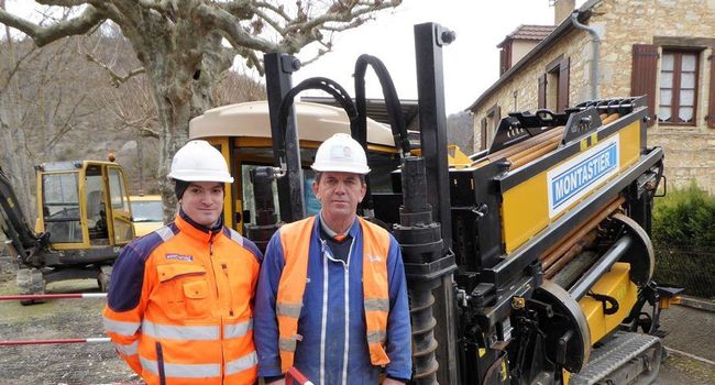 Dans le cadre des travaux en cours, pour l’enfouissement des réseaux électriques et de la traversée du bourg de Concorès, cette semaine a été marquée par le passage, sous la rivière «Le Céou», de câbles électriques avec la triple performance d’être : rapide, écologique vis-à-vis de l’environnement et sans inconvénient pour la circulation vers le hameau de Beauregard. Mission accomplie par la société Dordognaise Montastier, spécialiste des réseaux souterrains, intelligents et écologiques, qui travaille pour la Fédération Départementale d’Electricité du Lot. Lundi 13 février, la foreuse horizontale sans tranchée, était en place dès le matin. Dirigée de la surface par le responsable de chantier, Daniel Guillemet, la tête de forage, un tricône de 140 mm de diamètre munie d’un porte-sonde, a permis, à 2 m sous terre et sur 50 m de longueur, de passer sous le Céou. Fabien Callès, technicien, a quant à lui, vérifié au moyen d’un détecteur de surface que l’opération était conforme au plan (profondeur et direction). Le lendemain, une gaine de diamètre 200 mm sur 40 m de longueur, soudée bout à bout au fur et à mesure de la mise en place, passait sous le Céou (le tunnel de la Manche, en plus petit). L’entreprise EPEG (Nacelec) de Montgesty, mandataire, se félicite par l’intermédiaire de Cédric Raynal de cette opération rondement menée. Le lit de la rivière n’a pas été touché et le Céou peut continuer à couler en toute tranquillité.