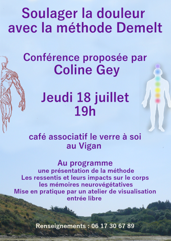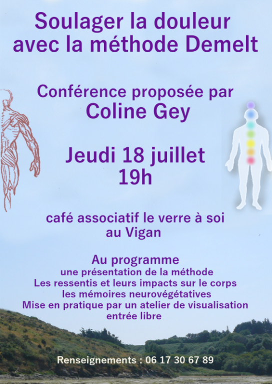 .Conférence : Soulager la douleur avec la méthode Demelt, technique de Réharmonisation énergétique. Cette présentation est proposée par Coline Gey, praticienne thérapie Holistique, jeudi 18 juillet à 19h au café associatif le verre à soi au Vigan. Les places sont limitées à l’espace disponible, n’hésitez pas à réserver.