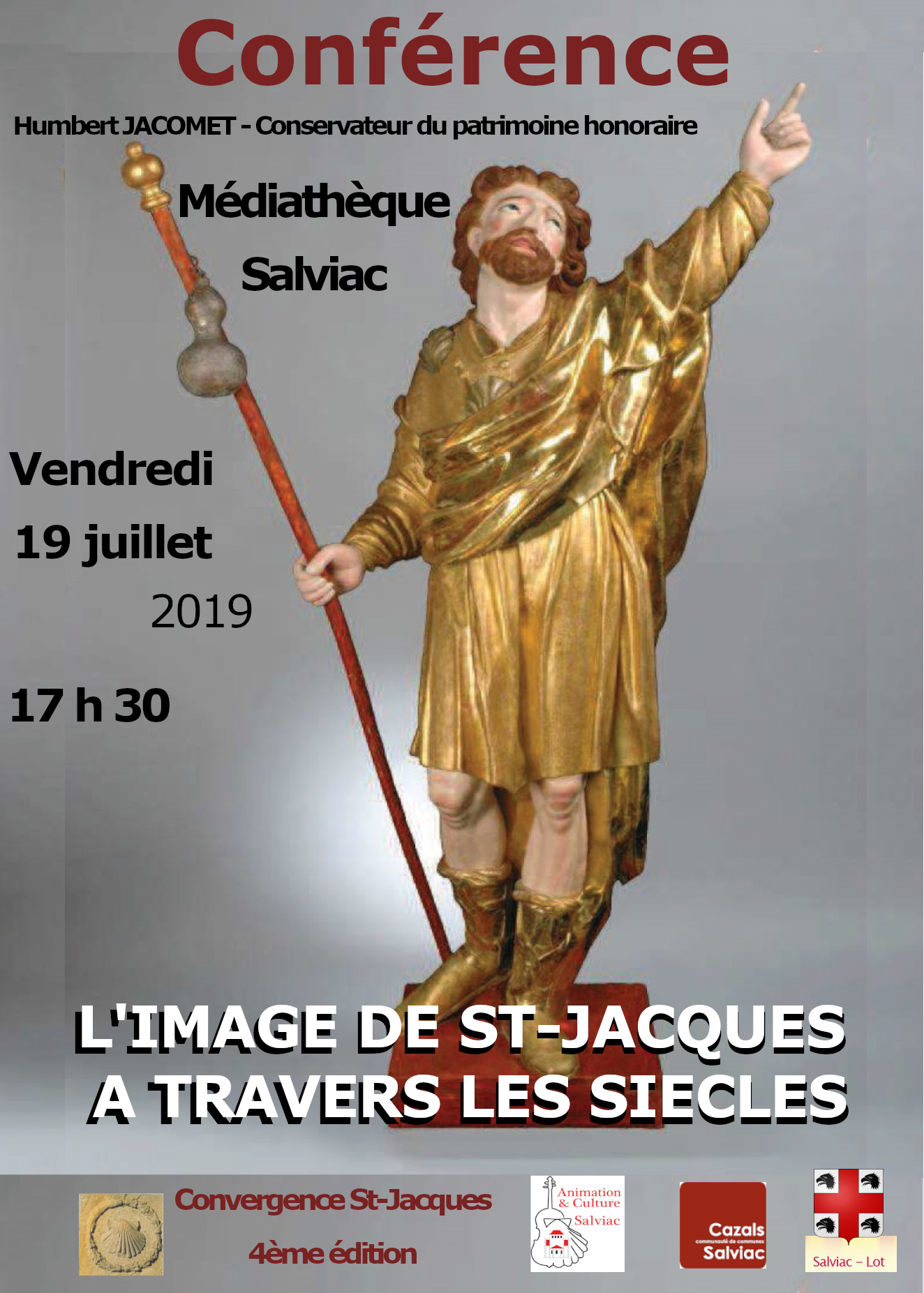 Vendredi 19 juillet, à 17 H 30, à la médiathèque de Salviac, Humbert JACOMET ( conservateur honoraire du patrimoine) donnera une conférence sur le thème de l’iconographie jacquaire à travers les siècles.