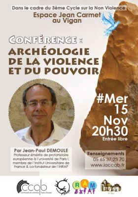 Pour clôturer le troisième Cycle sur la Non Violence, les services de la Communauté de Communes Quercy Bouriane, ont fait appel à Jean-Paul Demoule pour animer une conférence sur le thème de l’Archéologie de la violence et du pouvoir, le Mercredi 15 Novembre prochain à 20h30 à l’Espace Culturel Jean Carmet au Vigan.
