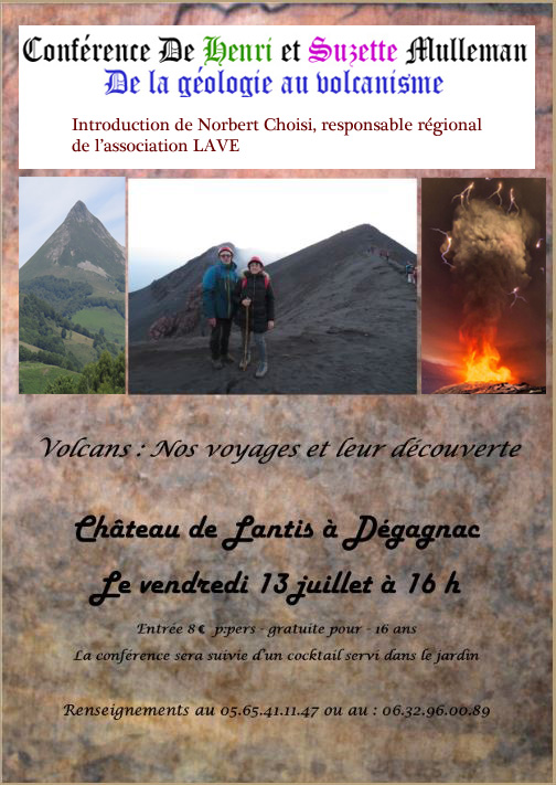 Henri et Suzette Mulleman nous ferons partager leurs voyages et découvertes des volcans à 16 heures dans la Salle des gardes au Château de Lantis à Dégagnac .
