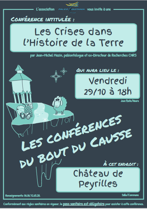 à 18h au Château de Peyrilles, Jean-Michel Mazin, paléontologue et ex-Directeur de Recherches CNRS donnera une conférence sur « Les crises dans l’Histoire de la Terre ». Résumé: En 3,5 milliards d’années, la Vie a dû s’adapter à tous les changements, notamment aux bouleversements écologiques ou géologiques provoquant de grandes vagues d’extinctions. Il y a 66 millions d’années, par exemple, les trois-quarts du monde vivant ont été balayés de la planète et voici 252 millions d’années c’est 90 % de la vie qui ont été exterminés. La vie pourrait-elle disparaître de notre planète?