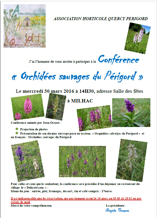 Le printemps semble s’installer aussi bientôt verrons-nous, au cours de nos promenades et randonnées, les talus, prairies et champs parsemés d’orchidées de toutes couleurs et variétés. C’est chaque année, un bonheur renouvelé que nous devons absolument préserver. Le 30 mars, L’Association Horticole Quercy Périgord recevra Monsieur Jean Orazio qui animera une conférence d’une projection de photos: « Les orchidées sauvages du Périgord » titre également de son dernier livre qu’il présentera durant cette réunion.