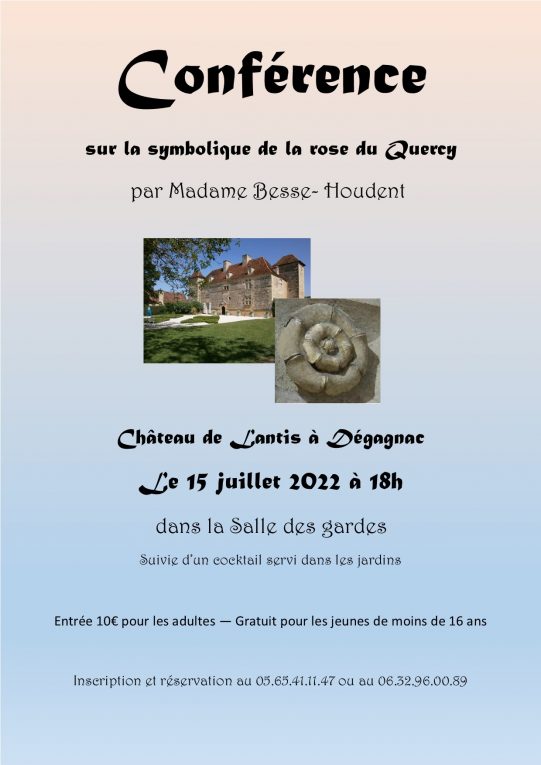 Dans le cycle des conférences estivales au château de Lantis à Dégagnac nous vous proposons une conférence sur la symbolique de la rose du Quercy vendredi 15 juillet au frais dans la salle des gardes .