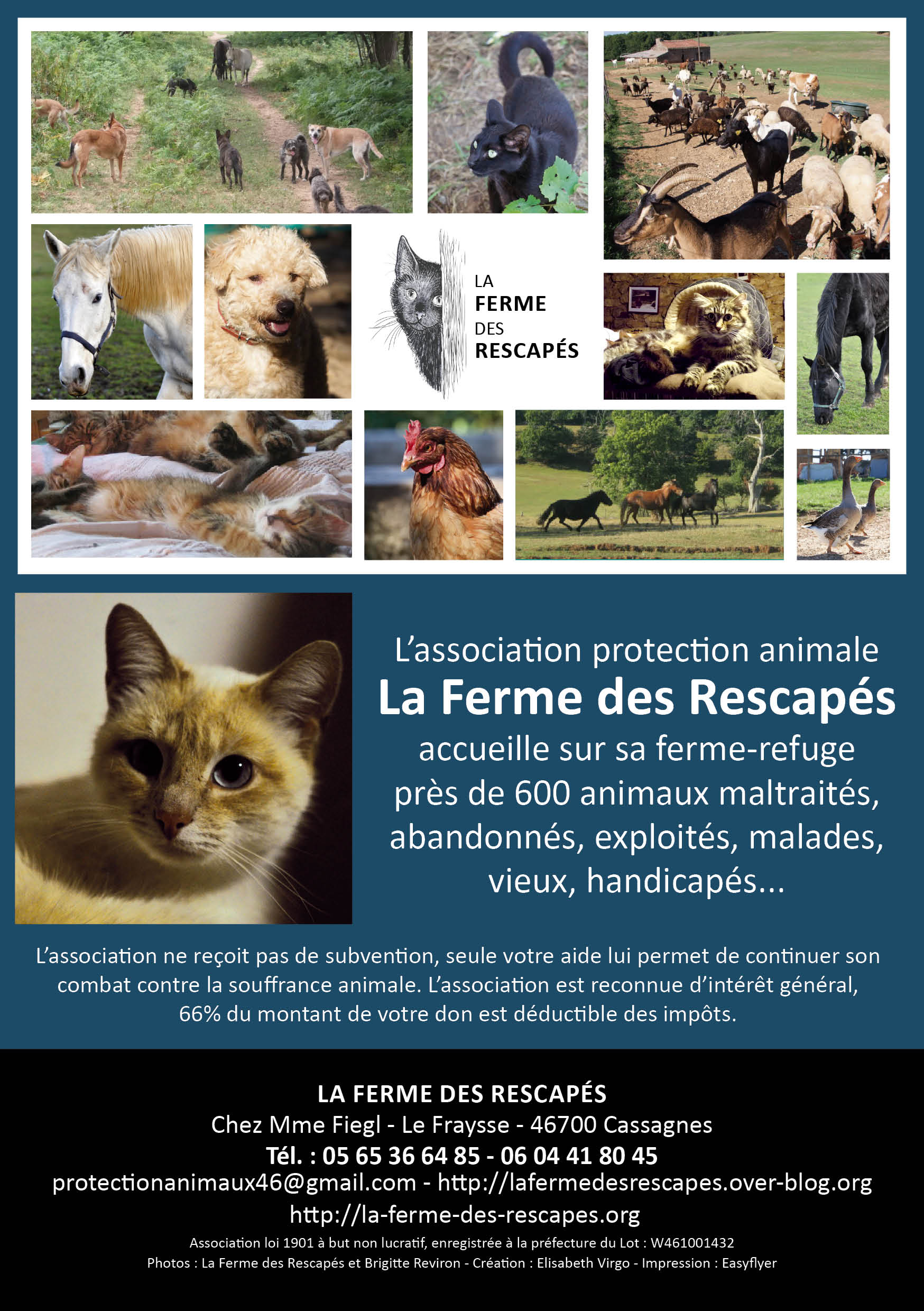 logoL’association de protection animale La Ferme des Rescapés, située dans le Lot à Cassagnes, à côté de Frayssinet-le Gélat, accueille sur sa ferme de 30 hectares des centaines d’animaux rescapés : des chats et des chiens bien sûr, mais aussi des chevaux, poules, lapins, ânes, chèvres, moutons… Ils sont plus de 600 à découvrir une autre façon de vivre, fondée sur un concept de liberté et de respect. Ils trouvent paix, amour, soins et nourriture.