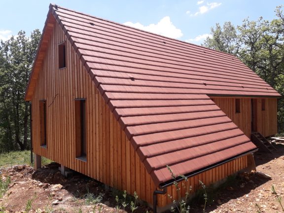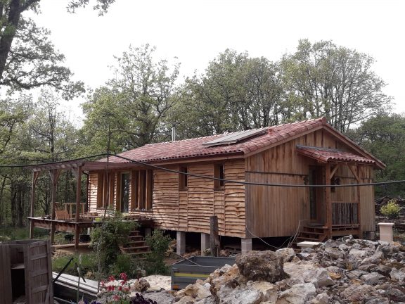 La seconde maison a une ossature douglas également sur pilotis, isolée de petites bottes de paille, équipée d’huisseries en chêne. Le bardage extérieur est de châtaignier, les enduits intérieurs sont en terre et les cloisons construites en pisé. Le sol reçoit une finition en tomettes sur une dalle isolée de liège, les parquets de bois sont en pin, et en acacia pour la salle de bain. Des enduits terre et chaux sable décorent les intérieurs. Un poêle à bois, un chauffe-eau solaire, des toilettes sèches complètent cette réalisation.