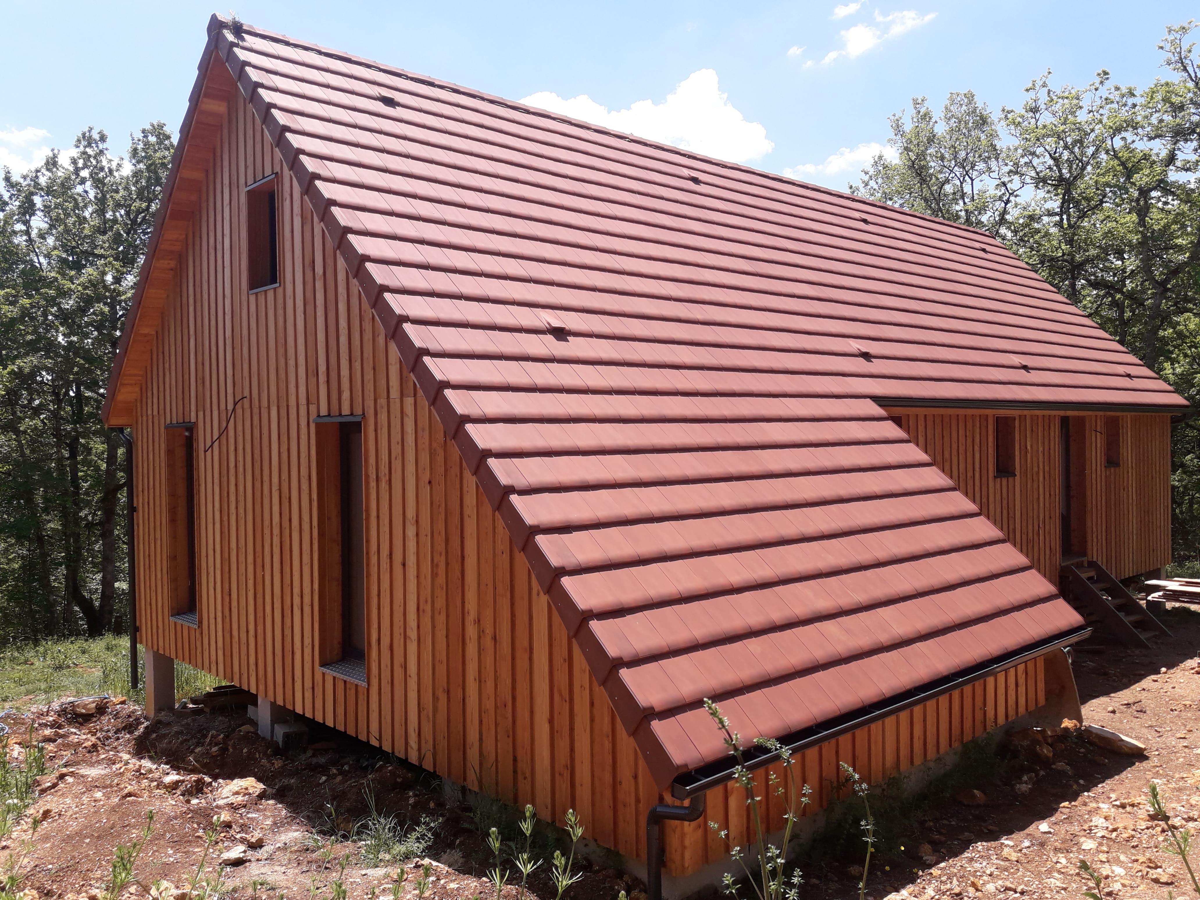 La première maison est un bâtiment construit en poteaux-poutres de douglas, elle est isolée en petites bottes de paille, y compris sa toiture, à l’exception du sol de cette maison sur pilotis, qui est une dalle bois insufflée de ouate de cellulose. Les pignons sont enduits en chaux sable sur des caissonnages d’aggloméré, à l‘image des autres enduits. Les huisseries sont de réemploi, et les équipements présents et à venir sont un poêle à bois, un chauffe-eau solaire, des toilettes sèches en parallèle de la phytoépuration, la récupération des eaux de pluie.