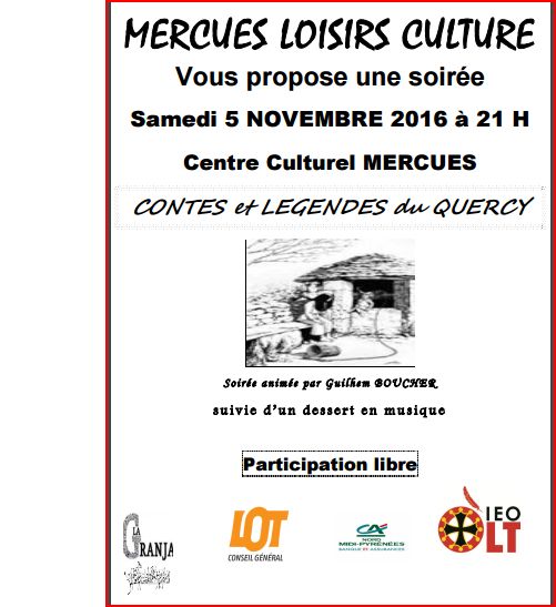 .Soirée proposée par ‘Mercuès Loisirs Culture ». Contes et Légendes  ont animé les veillées de nos campagnes il y a quelques décennies. Venez  les écouter, racontés par Guilhem BOUCHER. Français et Occitan se renverront la balle et tout le monde pourra comprendre.La soirée se poursuivra par un dessert en musique.