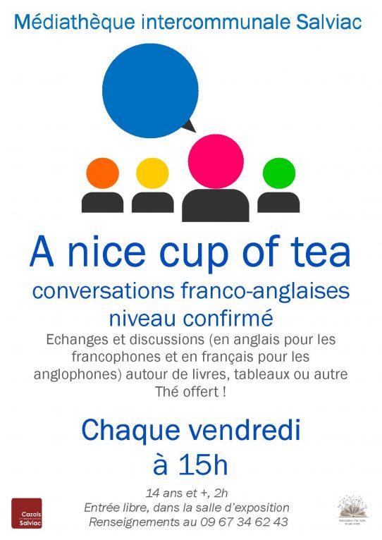 La médiathèque intercommunale Salviac vous propose chaque vendredi à 15h un atelier de conversation franco-anglaise « A nice cup of tea » niveau confirmé.