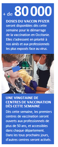 Ce bulletin confirme également la lancement de la campagne de vaccination en Occitanie, au fil de la réception des vaccins dans chaque département. Cette semaine, les premières opérations de vaccination sont en cours comme prévu dans 57 établissements pour personnes âgées dépendantes. Cette campagne s’accélère pour la vaccination des professionnels de santé, pompiers et aides à domicile, âgés de plus de 50 ans. Une vingtaine de centres de vaccination seront opérationnels dès cette semaine pour ces professionnels dans toute la région.