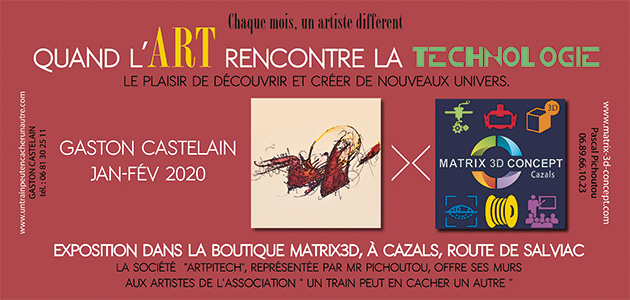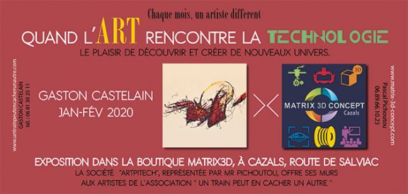 Matrix accueille pour deux mois en ce début d’année 2020, Gaston CASTELAIN. Artiste atypique, autodidacte, il est passionné par toutes les techniques de création artistique et se définit comme un « Calli-sculto-peintro-graphe » !