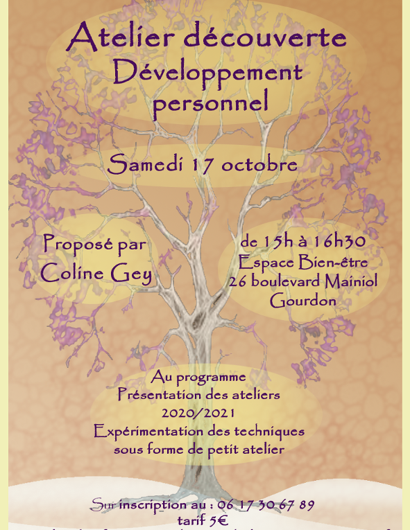 Samedi 17 octobre à partir de 15h, venez participez à l’atelier découverte que je propose à l’espace bien-être 26 Boulevard Mainiol à Gourdon. Il marque le démarrage des ateliers collectifs qui auront lieux une fois par mois tout an long de l’année scolaire.
