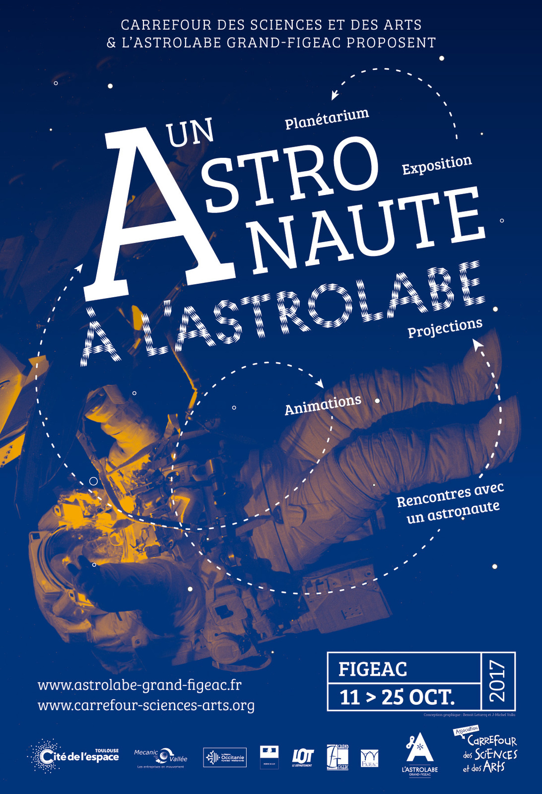 Afin de proposer un événement de plus grande ampleur, au-delà de la journée du 19 octobre, une programmation culturelle a été mise en place entre l’Astrolabe Grand-Figeac et l’association Carrefour des Sciences et des Arts du 11 au 25 octobre 2017.