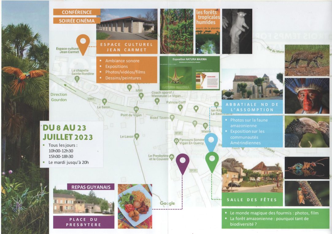 Depuis samedi 8 juillet la commune du Vigan est le lieu incontournable pour découvrir les splendeurs de la FORÊT AMAZONIENNE. De magnifiques photos de la faune et de la flore, dont certaines peuvent finir dans votre salon, vous sont proposées dans l’église, plus loin c’est les fourmis qui vous sont proposées dans la salle des fêtes et puis vous vous dirigez vers la salle Jean Carmet ou dés l’entrée vous serez plongés dans l’obscurité de la forêt pour ressortir et découvrir des tableaux, des photos et des planches explicatives sur la vie de la forêt.