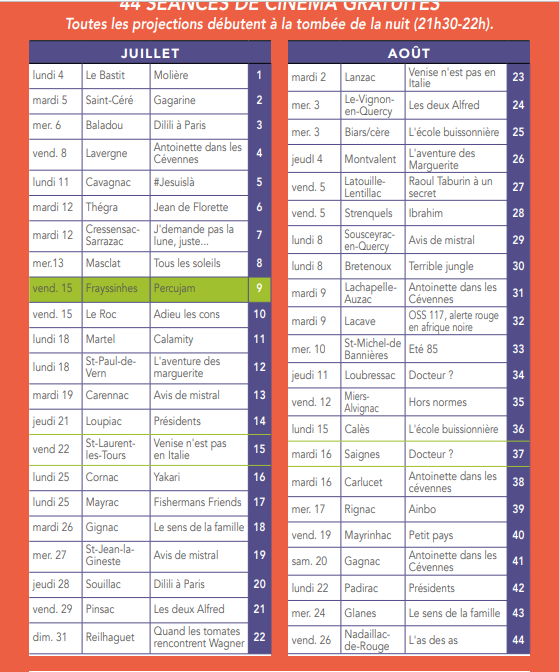 Comme chaque année, un festival est mis à l’honneur : pour 2022, c’est le documentaire Percujam, projeté le 15 juillet à Frayssinhes, qui fait le lien avec le Festiv’Arts à la ferme. Il dresse le portrait d’un groupe de jeunes musiciens autistes sur les routes de leur tournée. De Gignac à Sousceyrac-en-Quercy, en passant par Montvalent, Calès, Ladirat… les projections se dérouleront sur tout le territoire de la communauté de communes du 4 juillet au 26 août. Elles débuteront à la tombée de la nuit. En cas d’intempéries, des lieux de replis sont prévus sur chaque date.