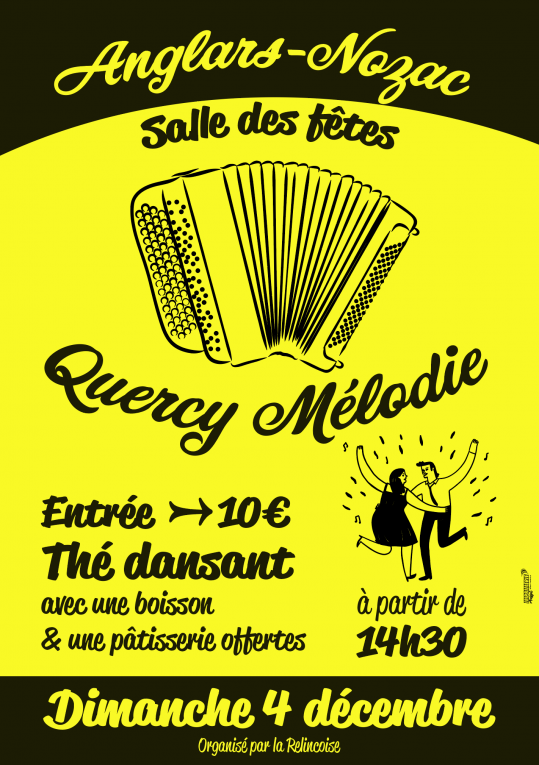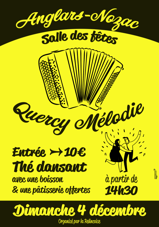 L’association La Relincoise organise le Dimanche 4 Décembre son premier thé dansant avec l’orchestre Quercy Melodie. Venez nombreux à partir de 14 h 30 pour danser et profiter de l’ambiance conviviale. Entrée 10 € avec pâtisserie et boisson offertes.