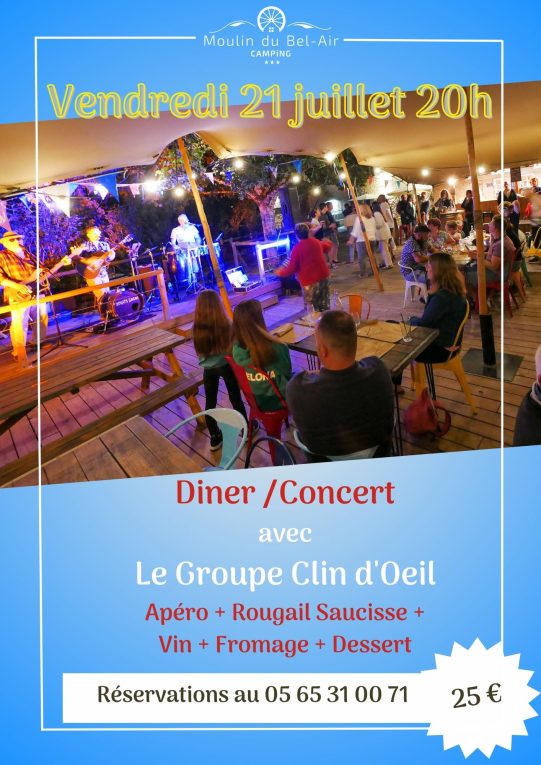Diner concert au camping « Le Moulin du Bel Air » de Saint Germain du bel air. Réservez votre soirée! 05.65.31.00.71 Publié le lundi, 17 juillet 2023lundi, 17 juillet 2023 par camping le moulin du Bel Air