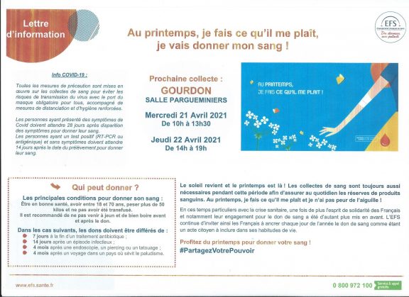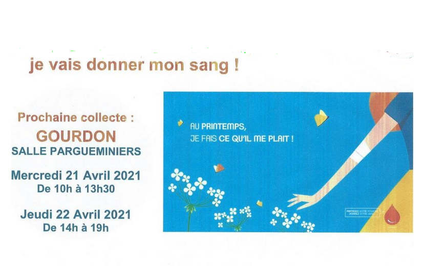 Don du sang à GOURDON les mercredi 21 avril 2021 et jeudi 22 avril 2021