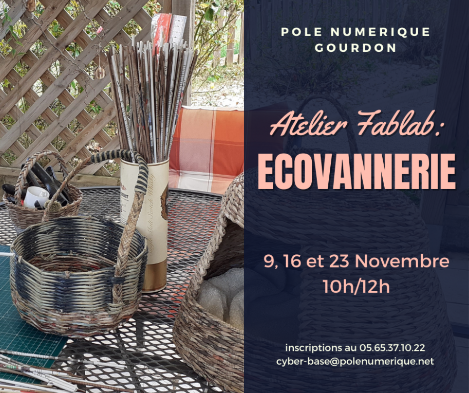 Dans le cadre des MARDIS RECYCLOLAB*, le Pôle numérique propose une session spéciale d’ateliers dédiés à la technique de l’éco-vannerie, confection d’objets issus de la récupération de papiers, le 9, 16 et 23/11, de 10h à 12h.