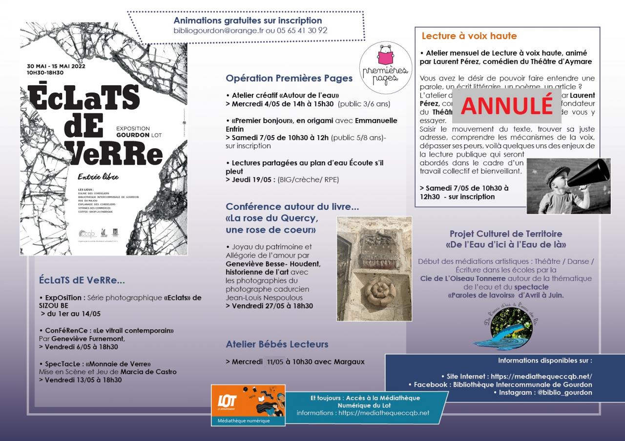 Eclats de verre à la BIG, programme de mai Publié le mardi, 3 mai 2022mardi, 3 mai 2022 par Bibliothèque Intercommunale Gourdon