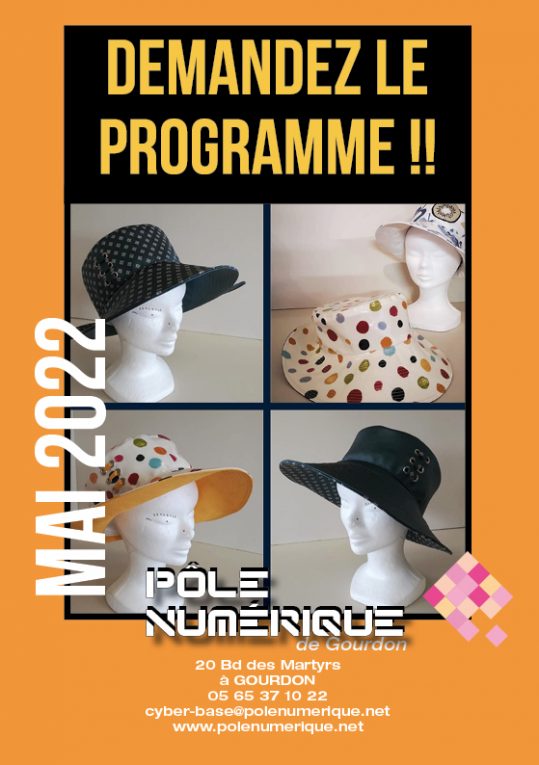 • CRÉATION D’UN CHAPEAU D’ÉTÉ avec la créatrice Biscouette de Martel :  Les mardis 10, 17, 24 et 31 Mai de 14h à 17h  – Dans le cadre des Mardis de découvertes FabLab, le Pôle Numérique vous propose un atelier de création d’un chapeau d’été avec la créatrice Biscouette située à Martel, l’une des premières utilisatrices du FabLab qui a développé son entreprise de couture, broderies et création de chapeaux, casquettes et chapeaux moulés. (Connaissances de base en couture demandées pour les particuliers et ouvert aux professionnels, 30€ les 4 demi journées suivies – sur inscription)