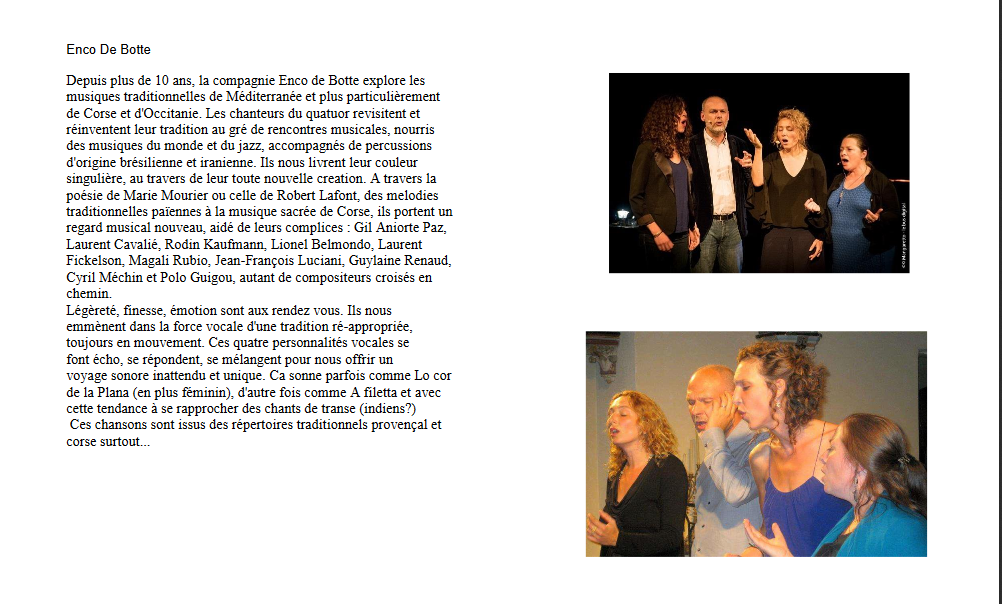Vendredi 28 juillet à partir de 20H30, C.A.P. Milhac vous accueillera pour le 2ème Concert des » 3ème Polyphonies en Bouriane » Avec Enco De Botte, un vent du Sud va souffler sur le Barri Haut de Milhac. Un programme de chants, a cappella, traditionnels en occitan provençal, Corse et bien au-delà…Des Voix superbes et puissantes s’élèveront dès le soir naissant pour un concert singulier que nous ne manquerions pas. Venez les écouter avec nous, un moment à partager unique!