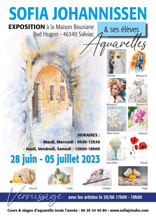 Comme chaque année année, l’artiste-peintre aquarelliste Sofia Johannissen organise une exposition annuelle de son atelier. C’est à nouveau à la Maison Bouriane à Salviac que l’événement se tiendra. Du 28 juin au 05 juillet, vous pourrez donc venir admirer le travail d’une quinzaine d’aquarellistes amateurs ou professionnels, ayant participé ces 12 derniers mois à des cours ou des stages que l’artiste a animé, que ce soit dans son atelier ou à l’extérieur, dans des villages, au parc animalier de Gramat, ou encore dans un champ de lavande… autour des oeuvres de l’artiste. Le tout promet une exposition riche en styles, couleurs et émotions. Un vernissage ouvert à tous, en présence des aquarellistes, est organisé le jeudi 29 juin à partir de 17h00.