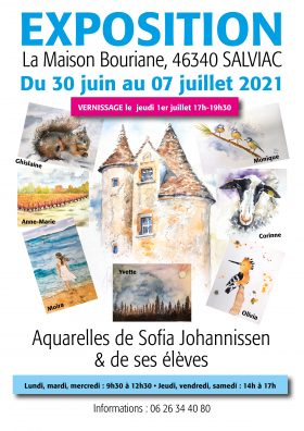 A partir de mercredi 30 juin et pour une semaine, 12 des élèves / participants aux stages de l’atelier SofiaJ Studio, se prêtent au jeu et participent à l’exposition annuelle. Plus de 50 aquarelles, dont une quinzaine de Sofia Johannissen, seront ainsi à voir dans la Salle Bouriane à Salviac.  Parmi les talents, cette année, deux jeunes enfants, de 7 et 9 ans, participent également ! L’ensemble promet d’être riche en couleurs et en styles. Soyez les bienvenus au VERNISSAGE, le jeudi 1er juillet, à partir de 17h !